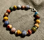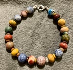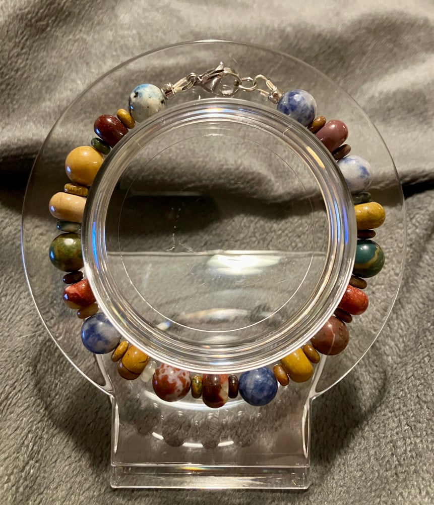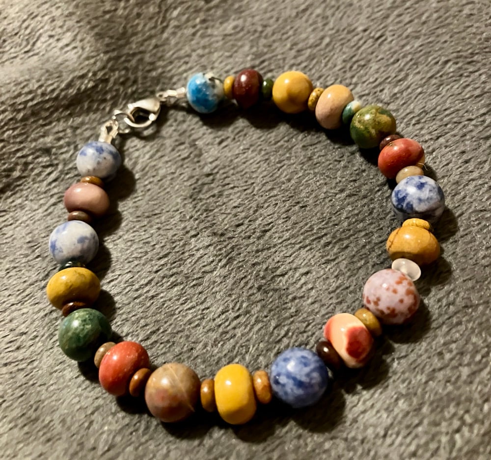 This bracelet features 8.5mm Snowflake Sodalite, 5×8mm Australian Mookaite, 8mm Ocean Jasper, and 8mm K2 Stone beads, accented with 2×4mm Ocean Jasper rondelle spacers. The palette is a tapestry of blues, creams, ochres, and mossy greens — each bead offering its own story in texture and tone. The ocean jasper rondelles add rhythm and movement, threading the design with quiet shimmer. Finished with a silver lobster clasp, this bracelet blends contrast and cohesion in a grounded, expressive silhouette.