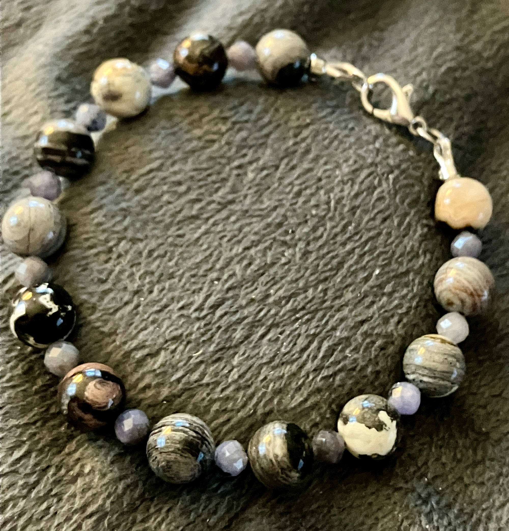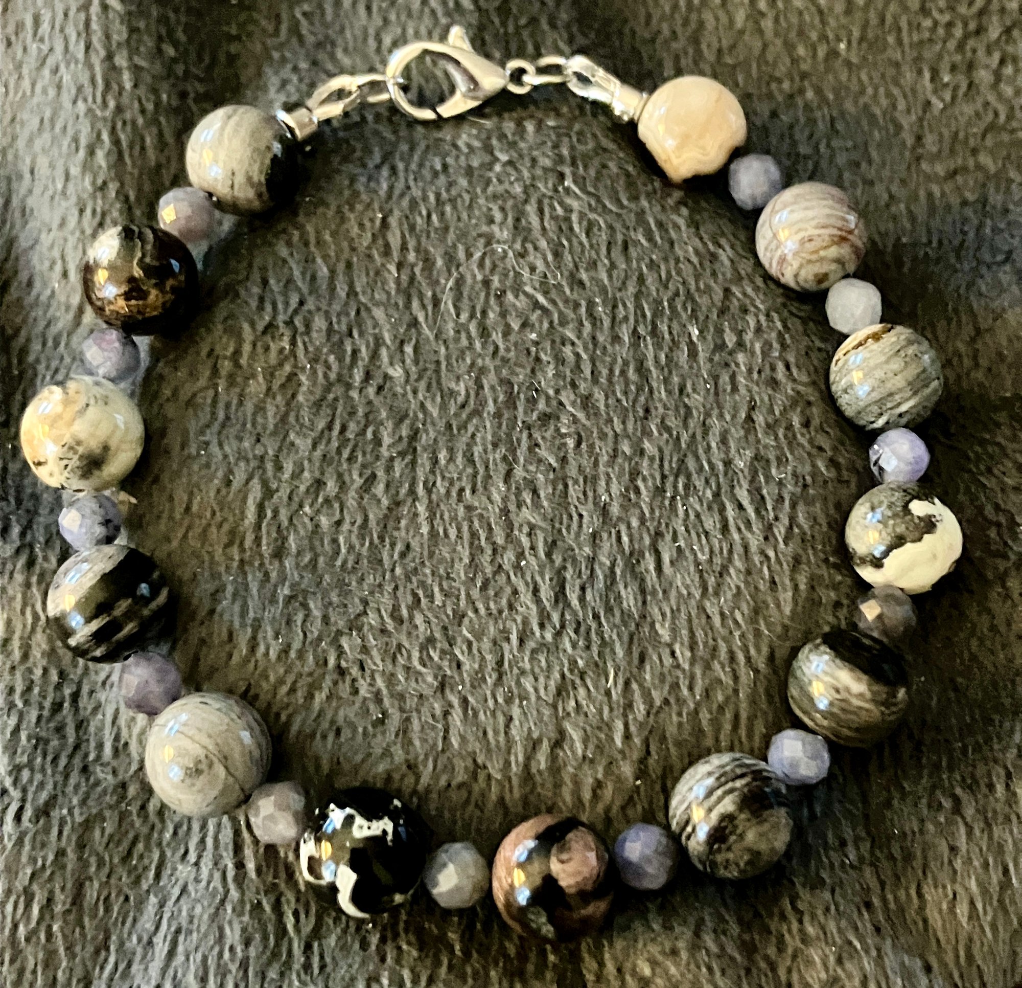 A bracelet that speaks in shadows and shimmer, this piece pairs the smoky marbling of 8mm Black Silver Leaf Jasper with the subtle sparkle of 4mm Faceted Tanzanite. The Jasper beads evoke mist-covered stone and ancient wisdom, grounding the design in earthy resilience.