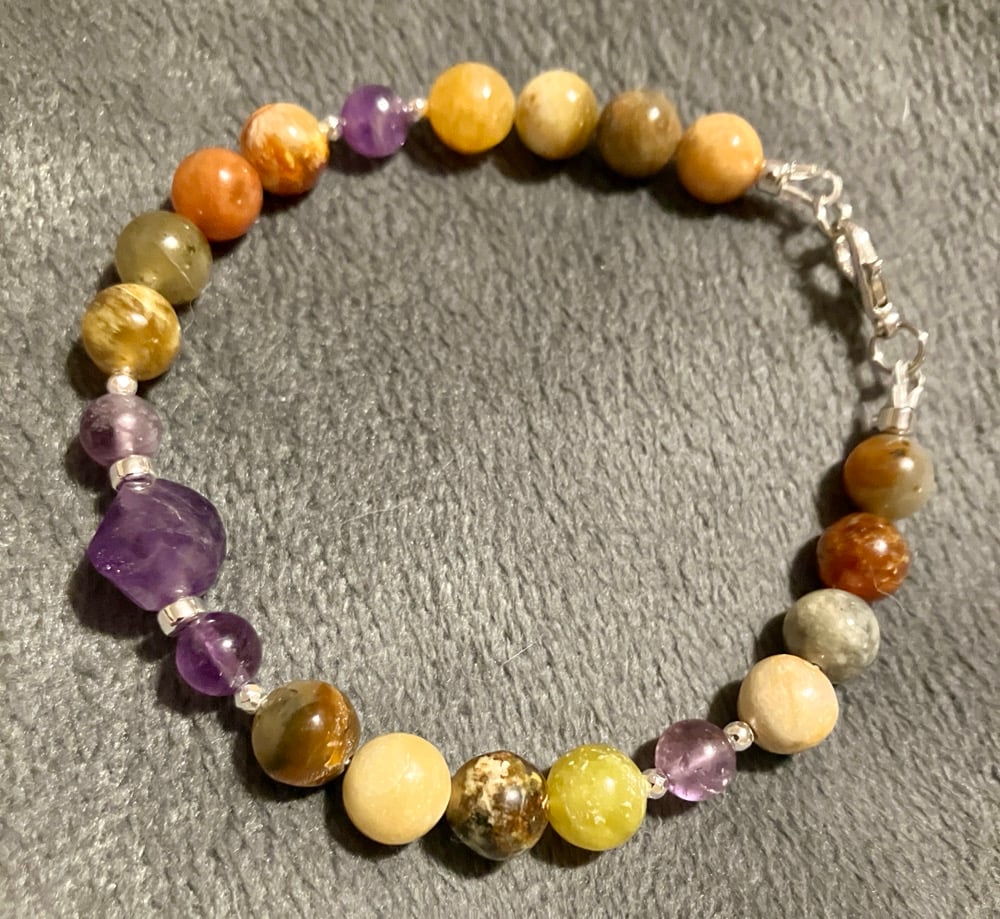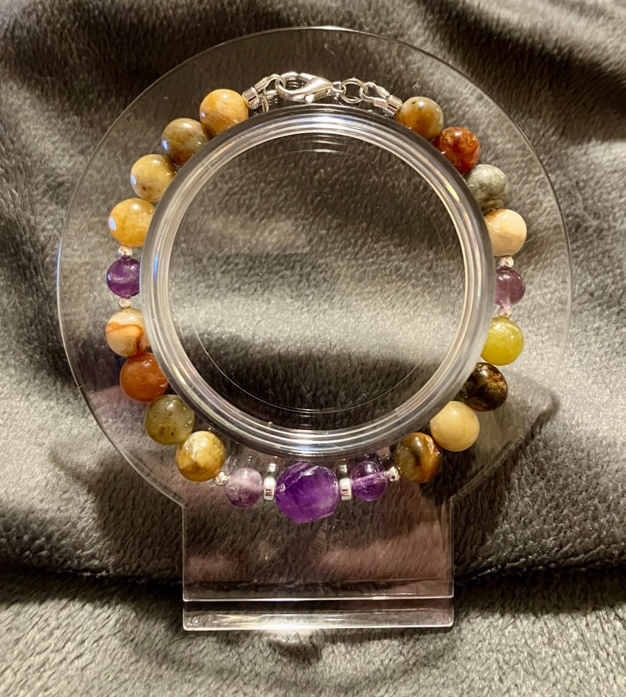 This bracelet features 7.8mm Flower Jade beads paired with 6mm Amethyst rounds and a 10mm faceted spiral-cut Amethyst sphere. Accented with both 2mm and 3×2mm faceted bright silver Hematite spacers, the design balances soft earth tones with luminous violet and sleek metallic rhythm. The jade offers a gentle, mottled palette of greens and creams, while the amethyst adds clarity and sparkle. Finished with a silver lobster clasp, this piece evokes harmony, movement, and quiet strength.