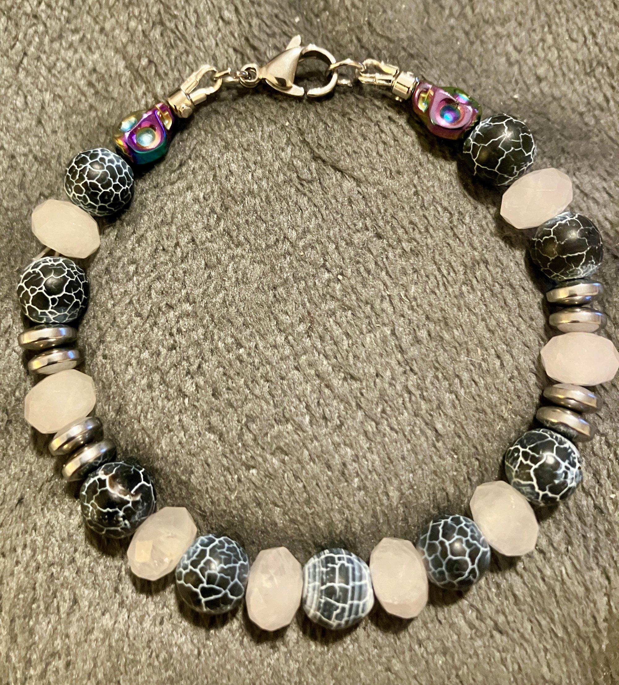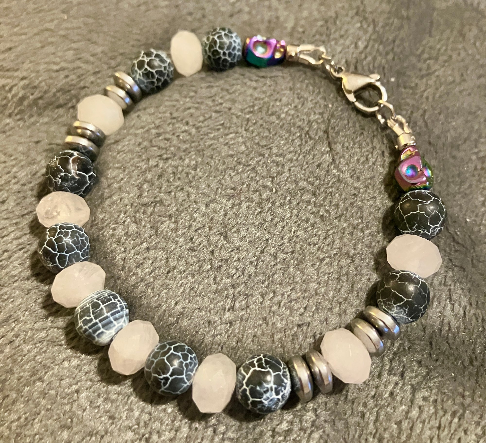 A bracelet that blends softness with edge, this piece features 8mm Frosted Gray Dragon Vein Agate—each bead veined like ancient stone, offering grounding and intuitive clarity. Faceted Rose Quartz rondelles bring a gentle blush of compassion and emotional healing, nestled between sleek Silver Hematite disks that sharpen the design with metallic precision.