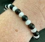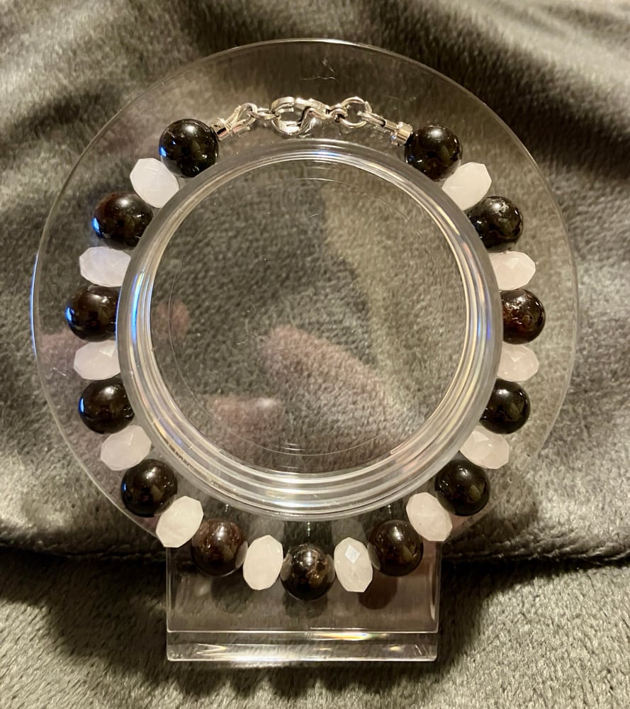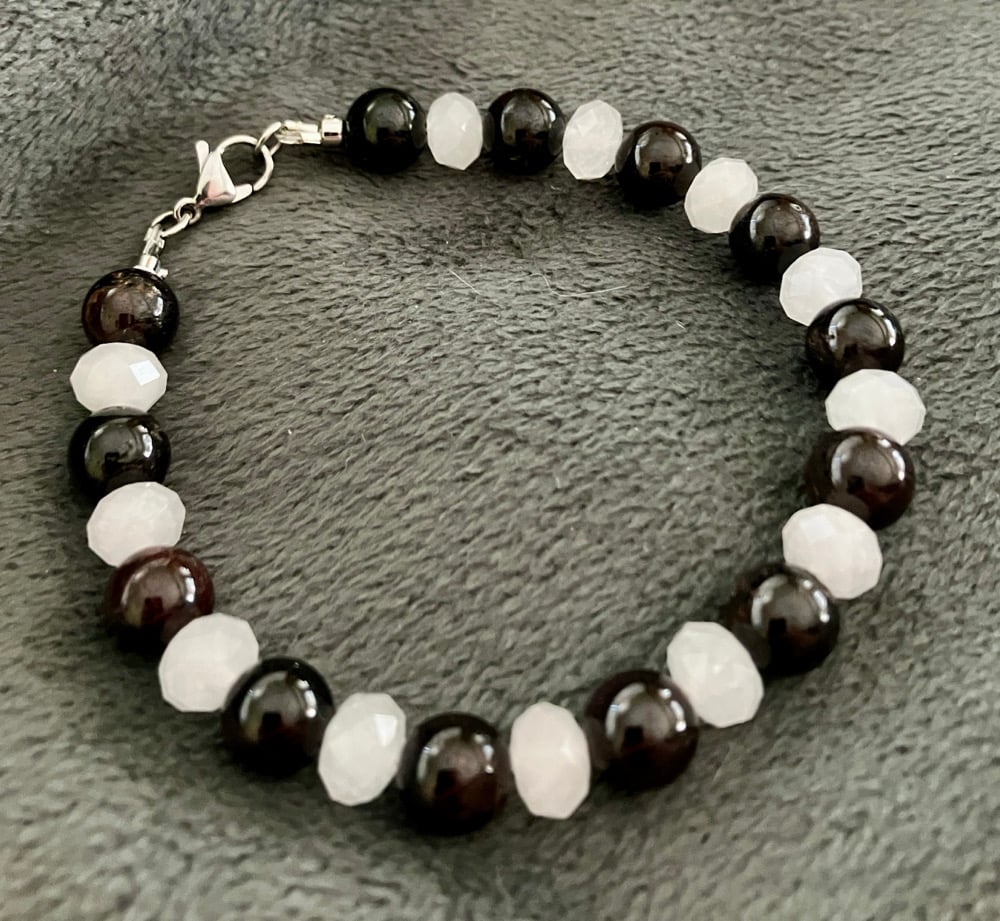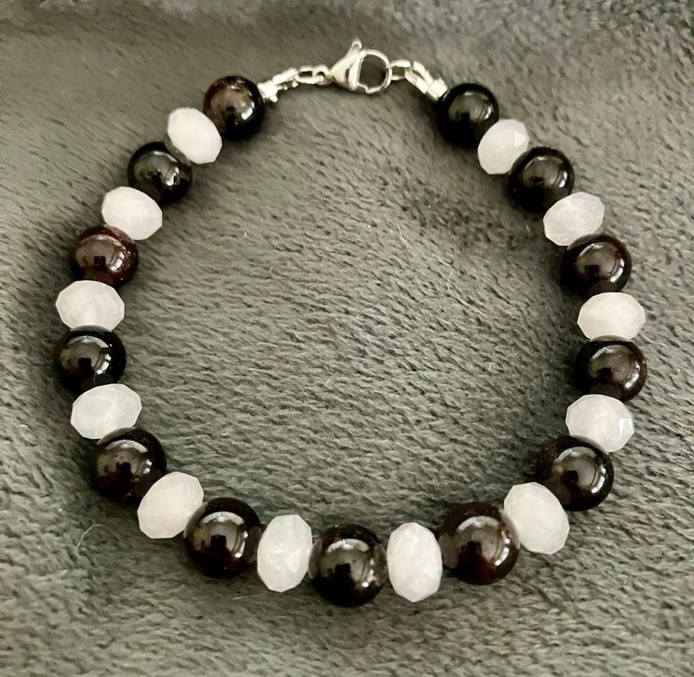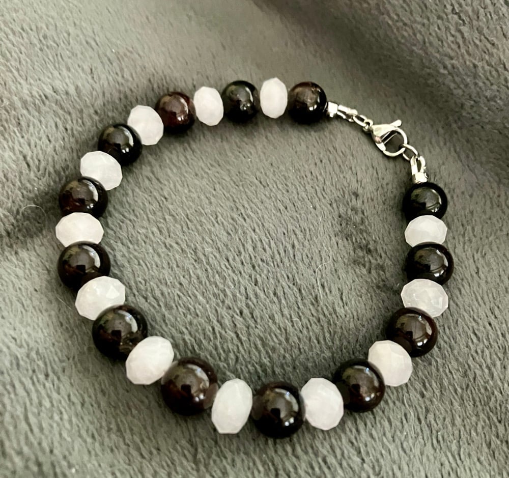 This bracelet features 8.5mm Red Garnet beads paired with 5×8mm faceted Rose Quartz rondelles. The garnet beads offer a deep, wine-toned richness with a subtle inner glow, while the rose quartz adds soft translucence and gentle sparkle. The faceted rondelles catch light with every movement, creating a rhythm of warmth and reflection. Finished with a silver lobster clasp, this piece blends intensity and tenderness in a balanced, elegant silhouette.