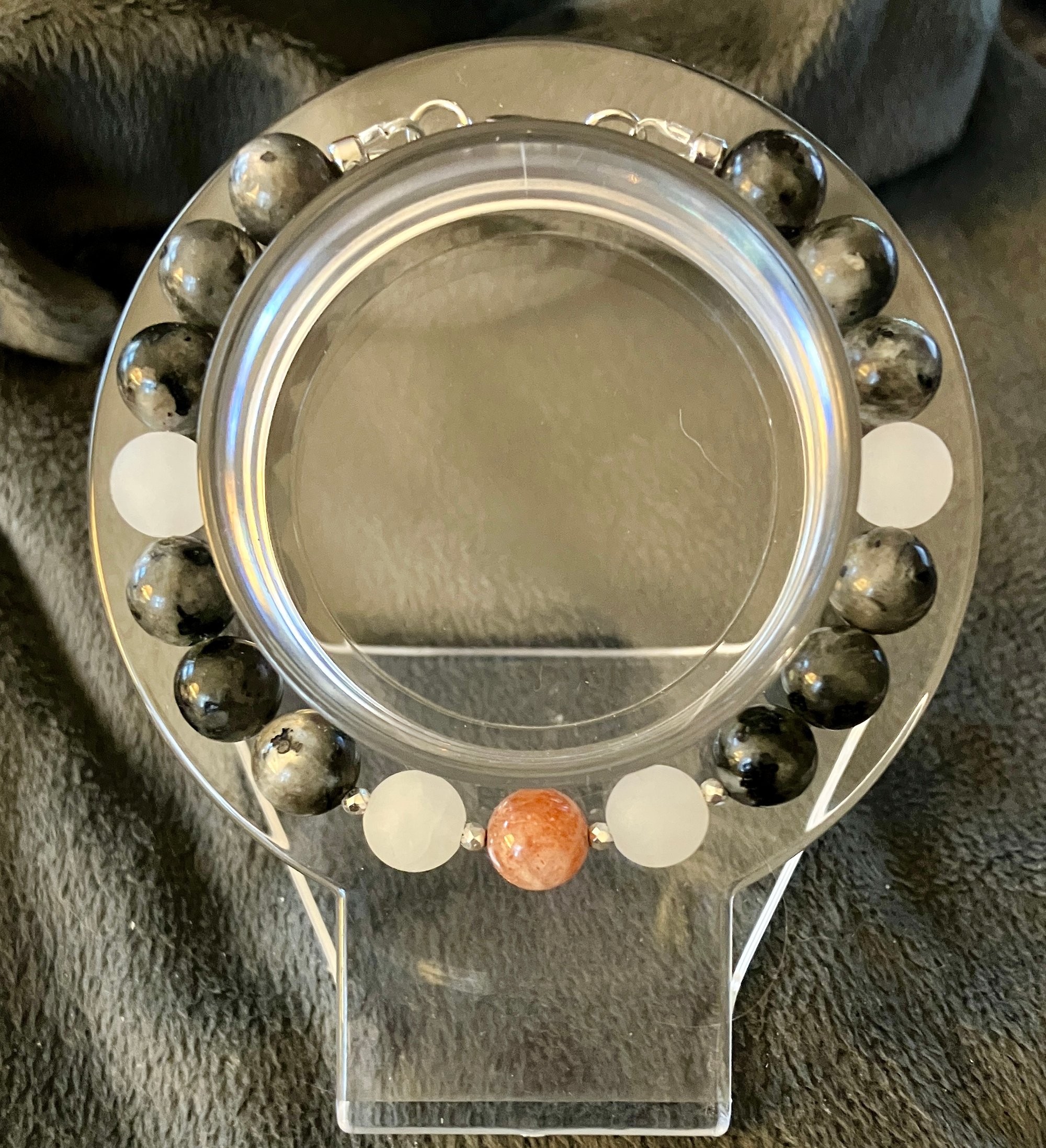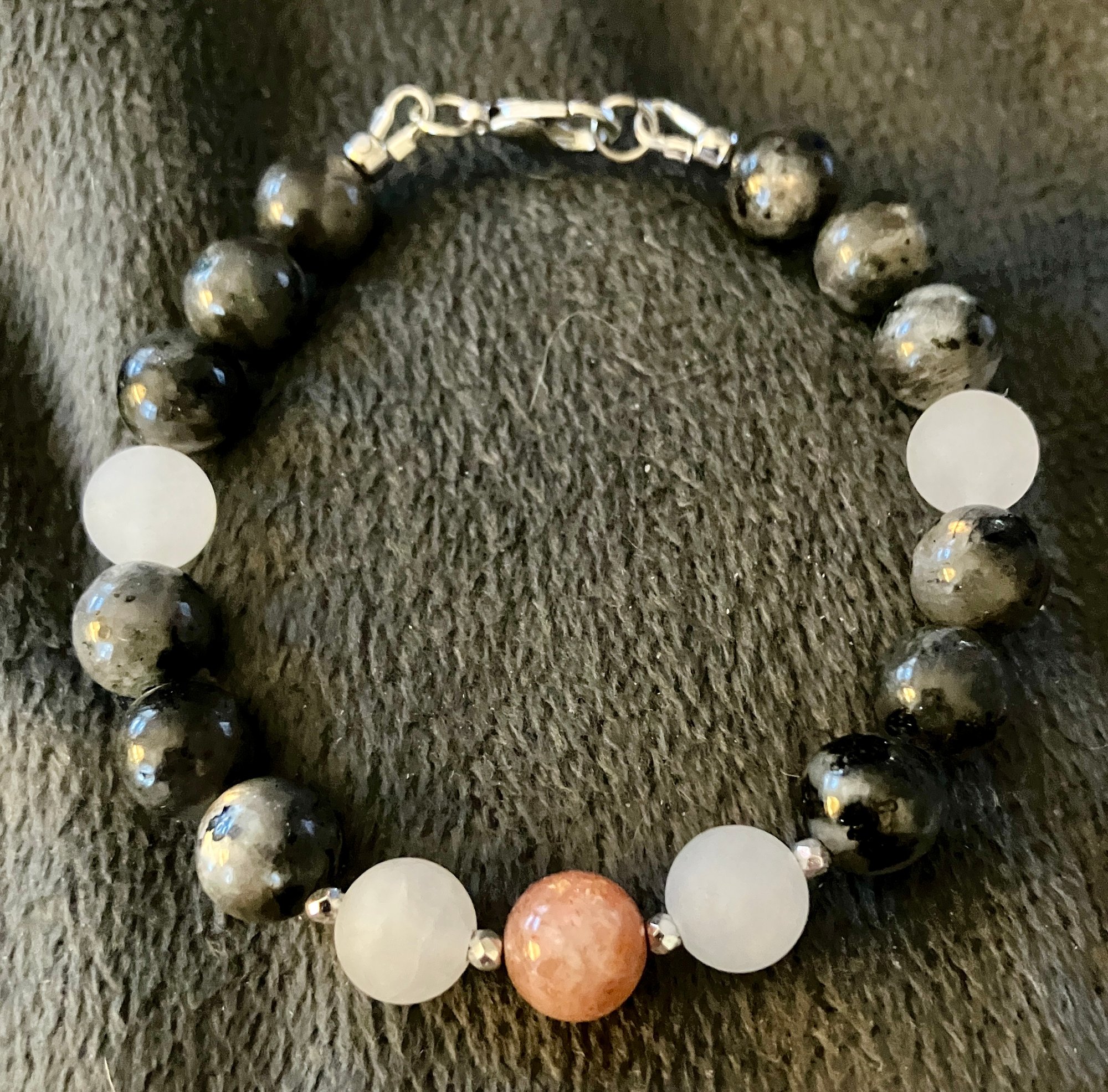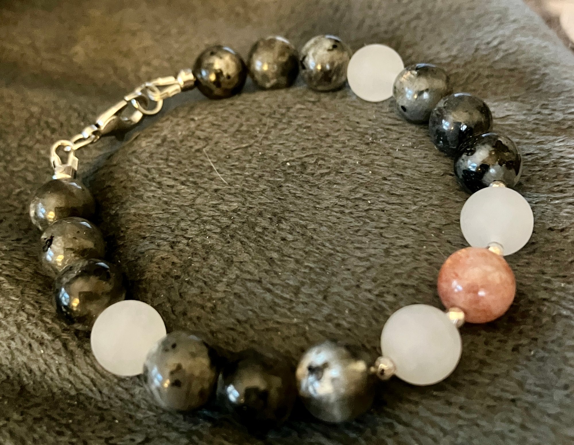 Larvikite, Matte White Jade, Faceted Bright Silver Hematite & Sunstone - Size 6.25
