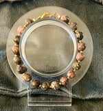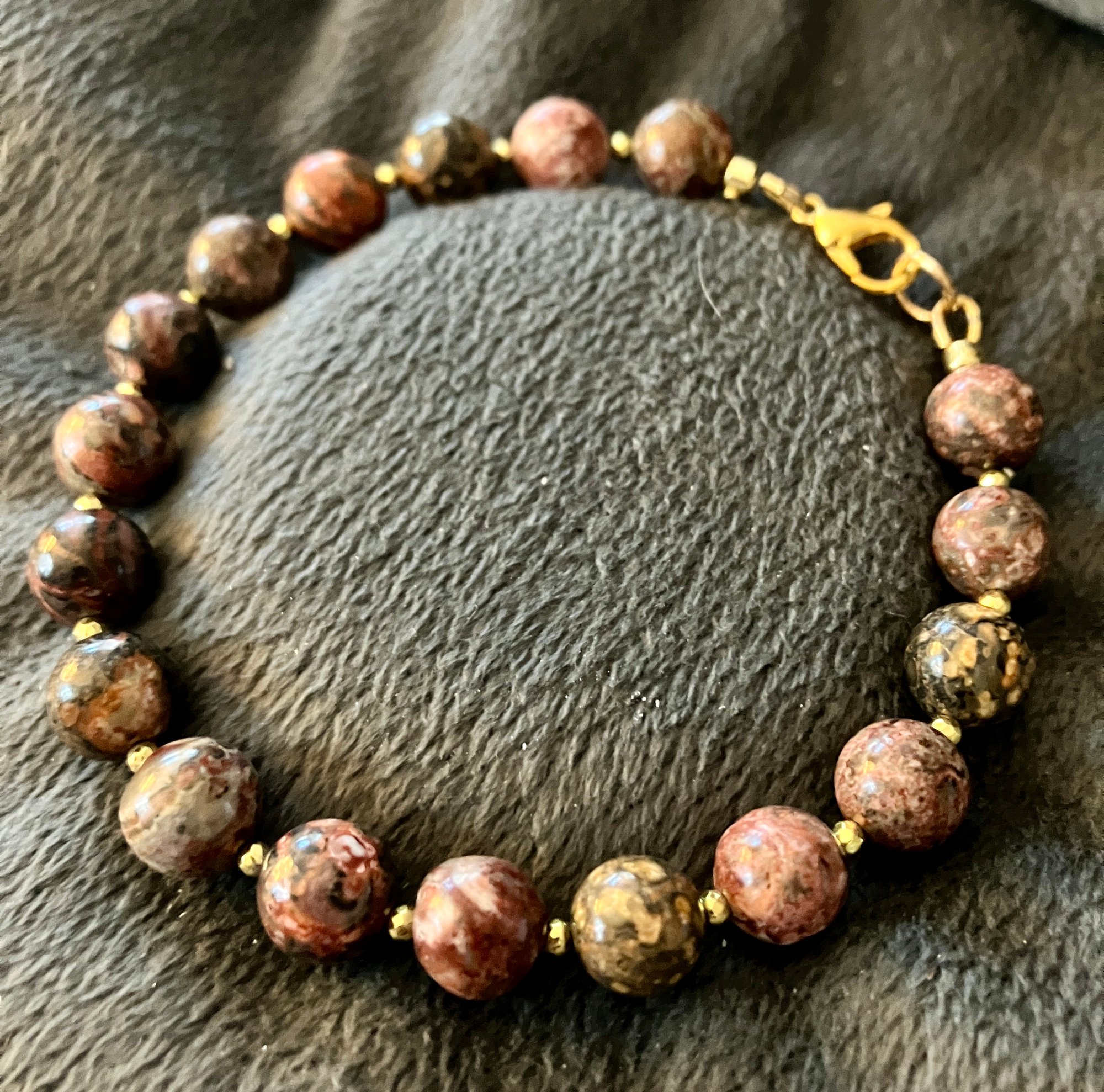 Earthy meets opulent in this striking bracelet, where the natural marbling of Leopard Skin Jasper evokes ancient terrain and primal energy. Each bead carries a unique pattern—swirls of russet, charcoal, and ochre—like miniature landscapes frozen in stone.