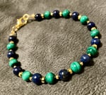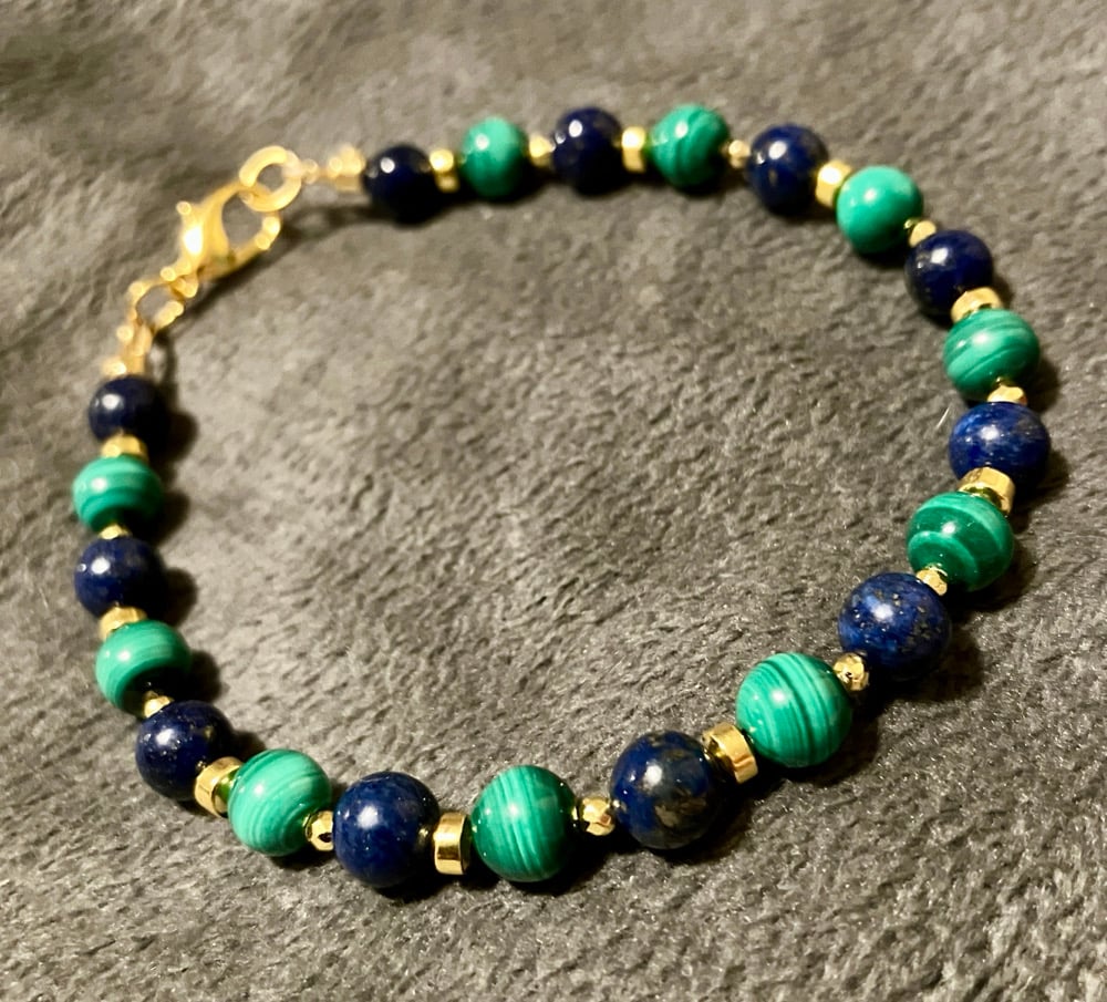 This bracelet features 6mm Malachite and 6mm Dark Blue Lapis Lazuli beads, accented with a combination of 2mm faceted and 3×2mm bright gold Hematite spacers. The malachite beads display vivid green banding with natural striations, while the lapis offers a deep celestial blue with subtle flecks of pyrite. The gold hematite spacers add warmth and structure, threading the design with a luminous rhythm. Finished with a gold lobster clasp, this bracelet evokes richness, clarity, and grounded elegance.