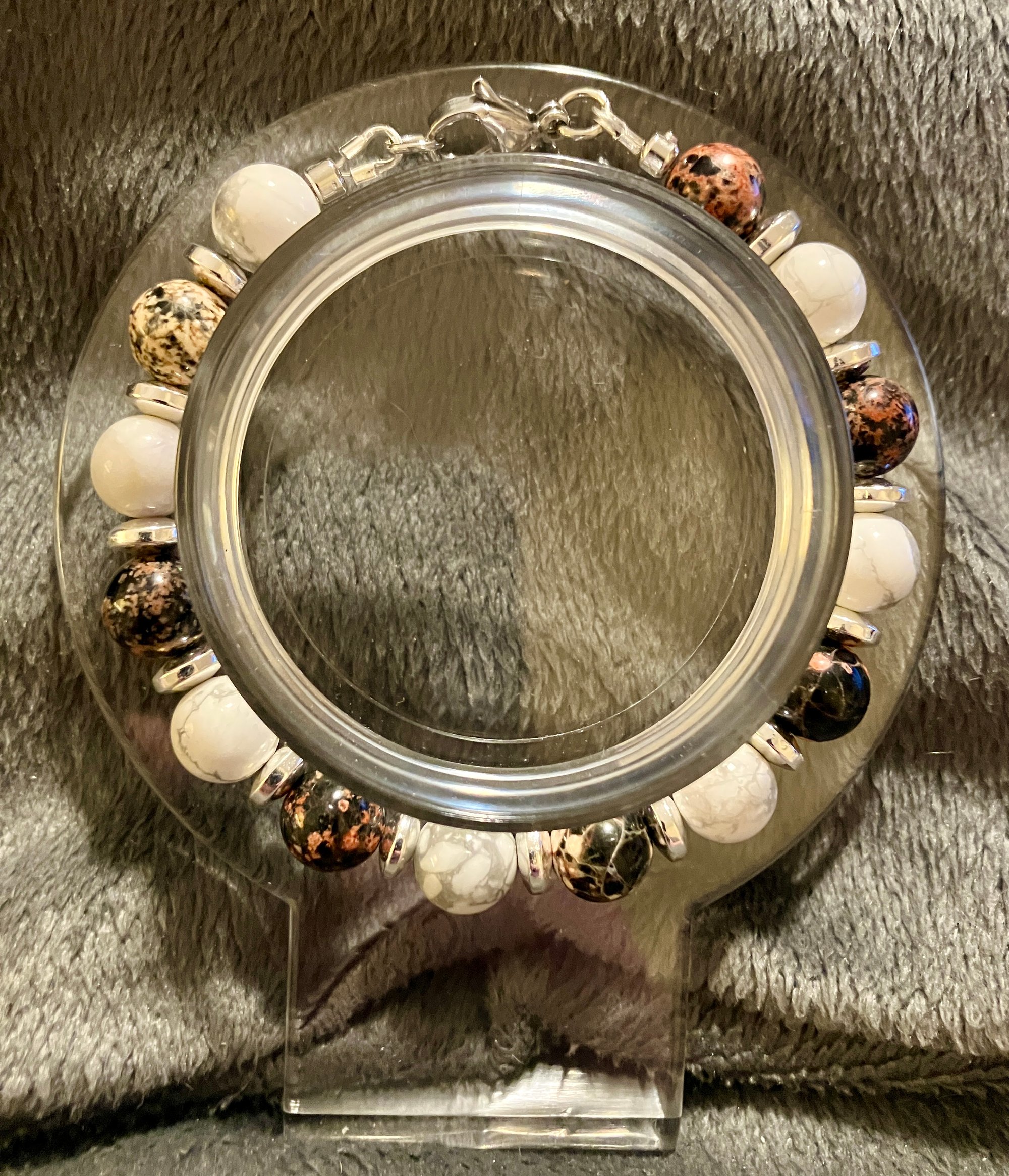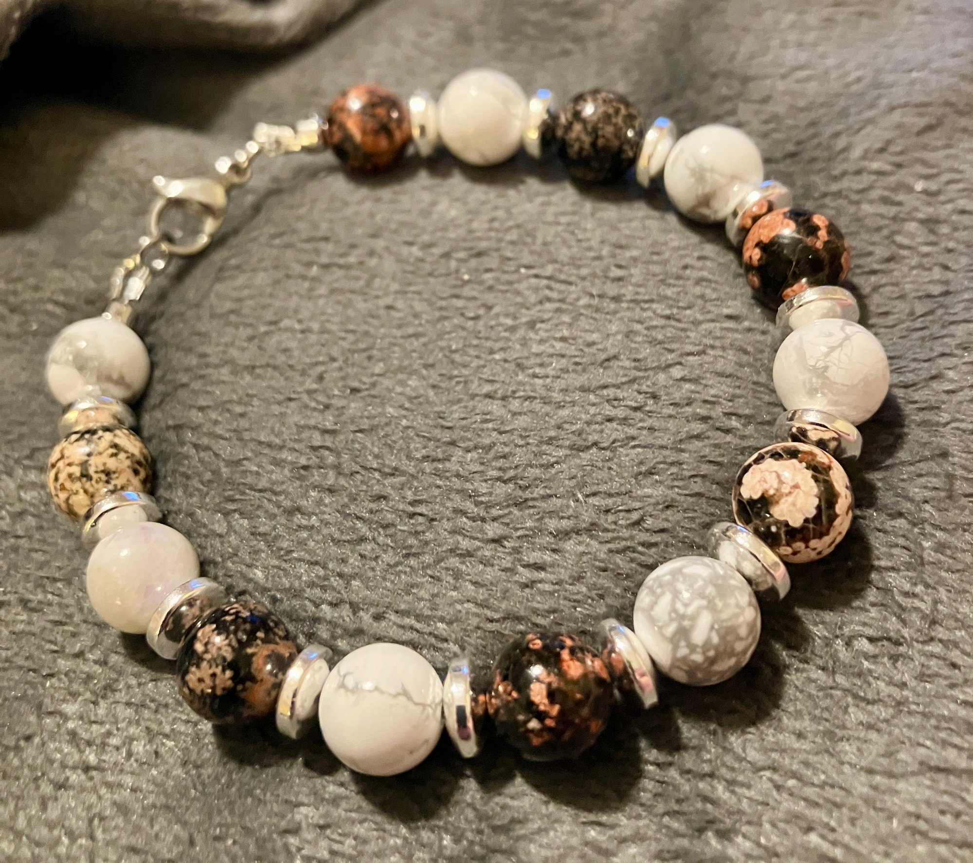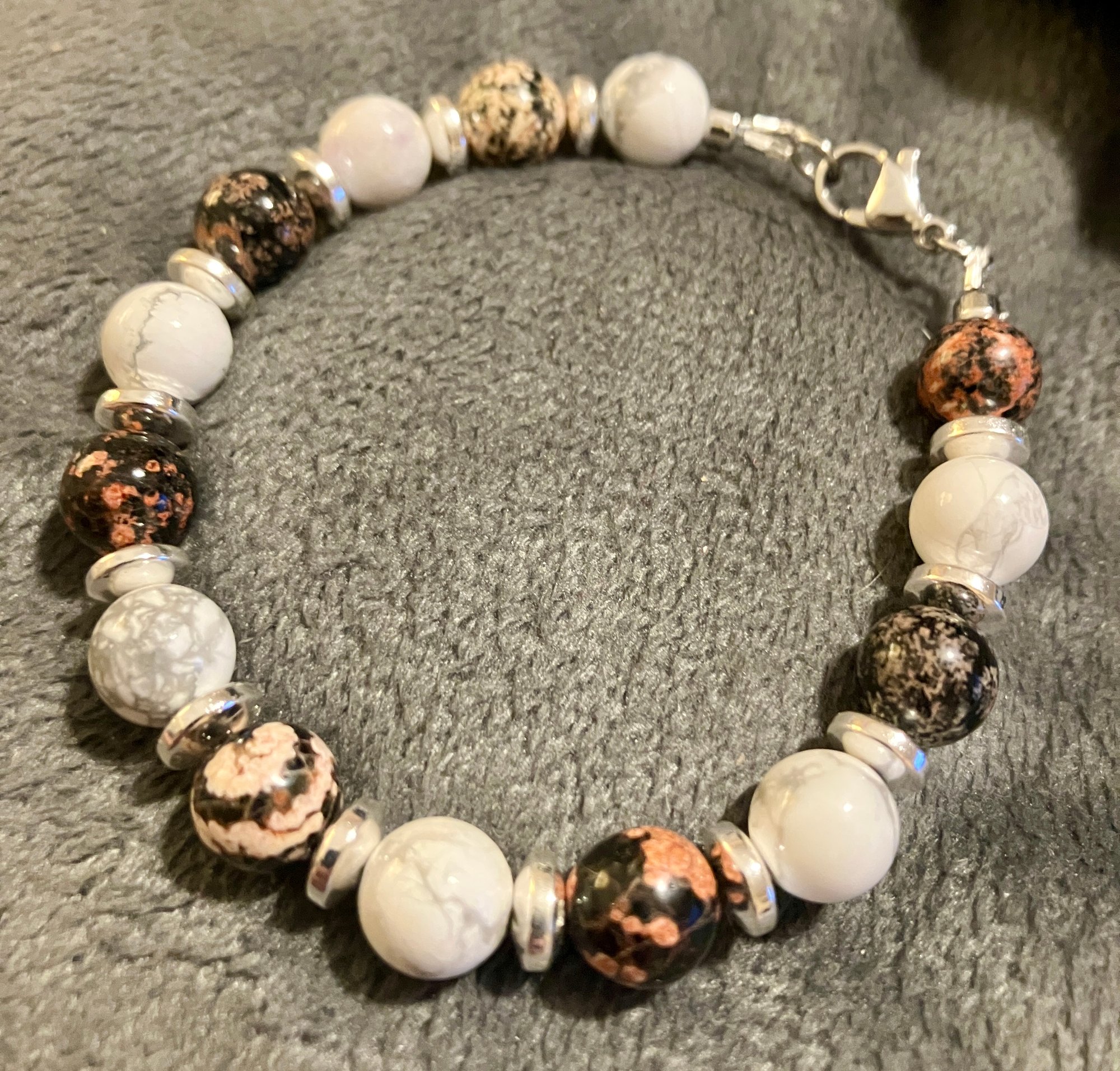 This bracelet blends volcanic fire with tranquil clarity. Mexican Red Snowflake Obsidian pulses with earthy reds and charcoal swirls, a stone of transformation and protection. Paired with the soft veining of 8mm Howlite, it invites calm, patience, and emotional balance.