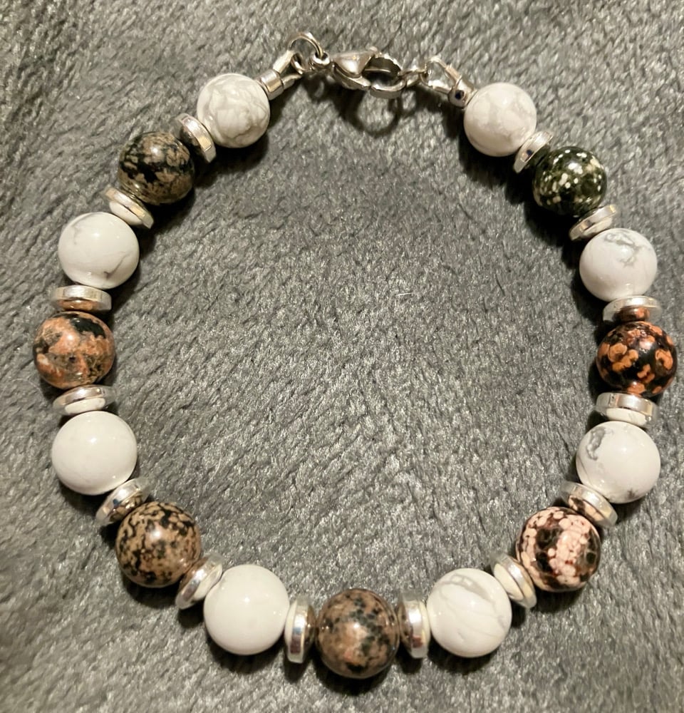 This bracelet features 8mm Mexican Red Snowflake Obsidian beads paired with 8mm Howlite rounds and 6×3mm bright silver Hematite spacers. The obsidian beads display a rich palette of deep reds and black with natural snowflake-like inclusions, while the howlite offers a soft white base veined with subtle gray. The silver hematite adds polish and rhythm, tying the design together with a clean, reflective finish. Finished with a silver lobster clasp, this bracelet balances bold texture with quiet clarity.