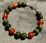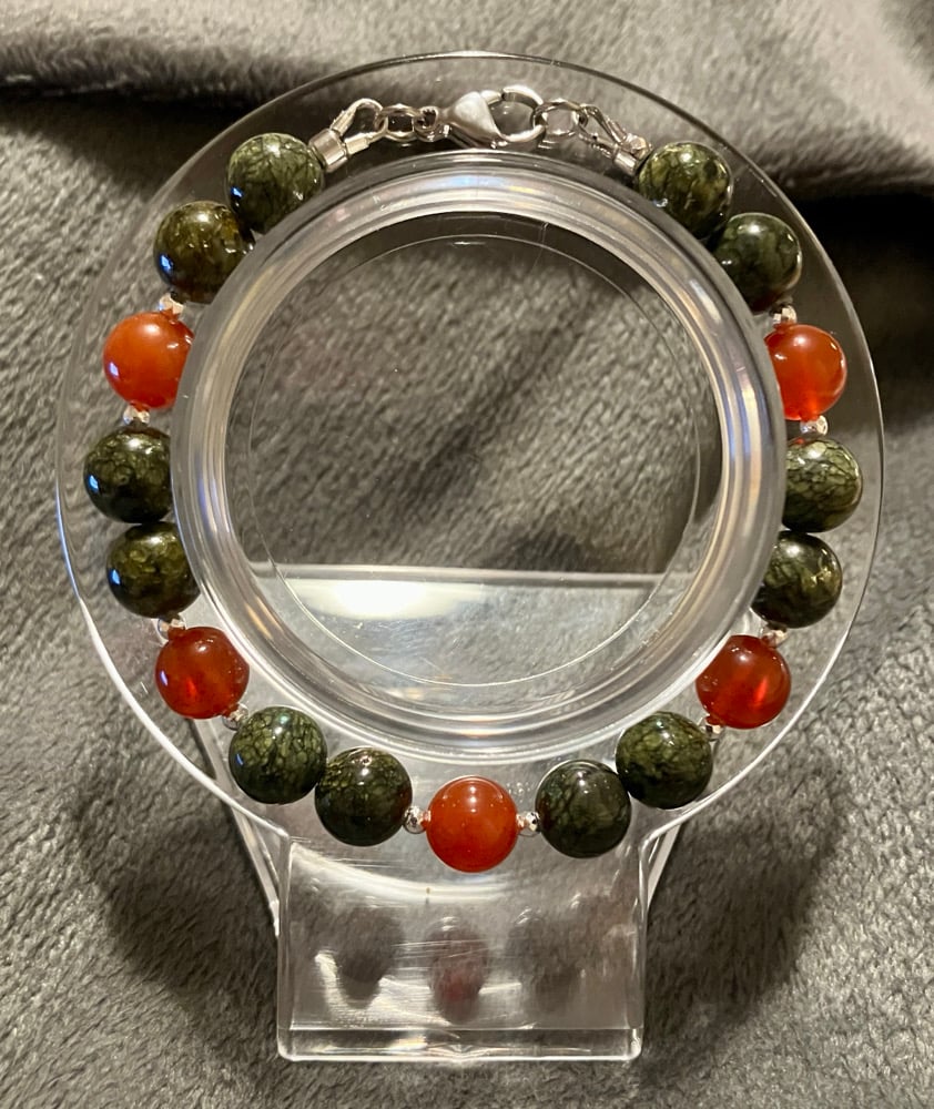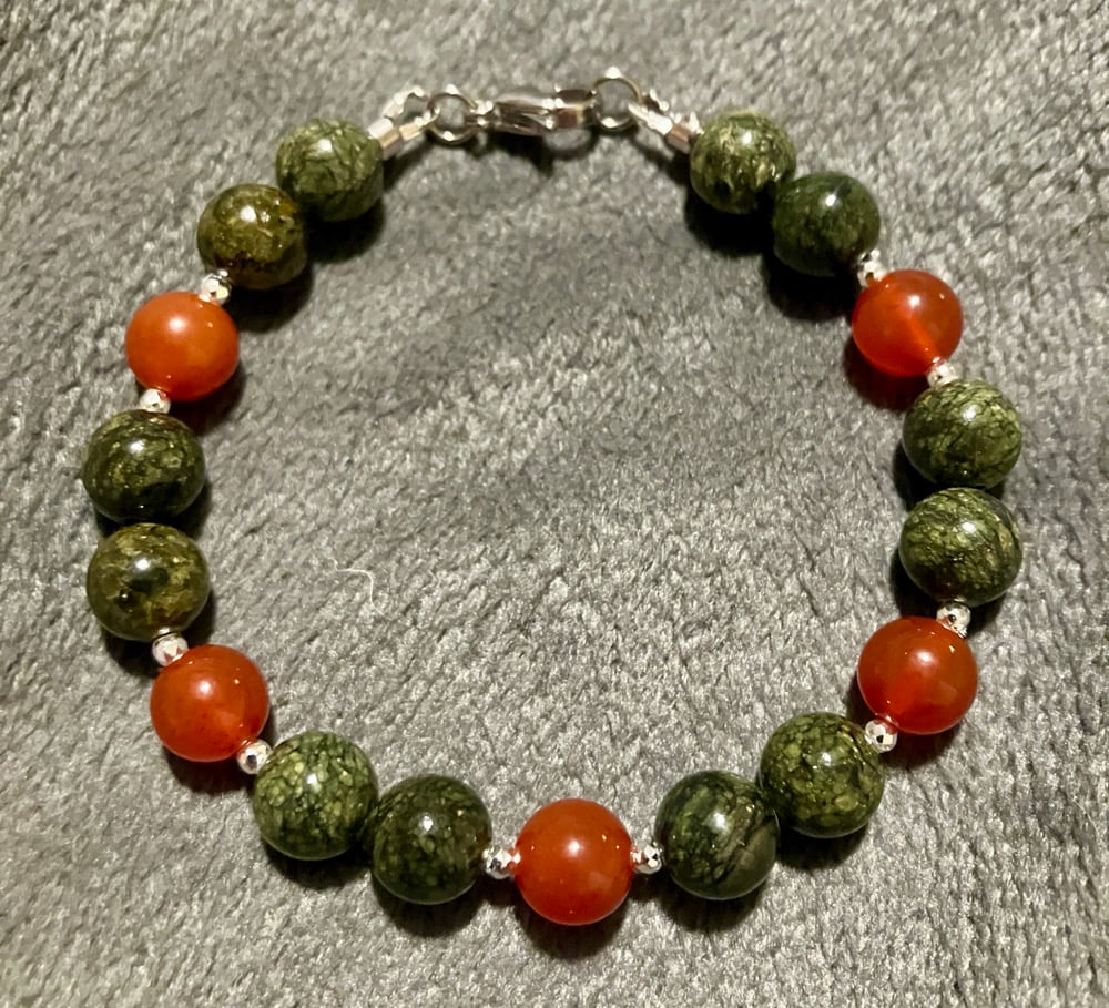 This bracelet features 8mm Russian Serpentine and 8mm Carnelian beads, accented with faceted Hematite spacers. The serpentine beads offer a deep mossy green with natural marbling, while the carnelian glows with warm red-orange translucence. The hematite adds sleek contrast and structure, threading the design with quiet strength. Finished with a silver lobster clasp, this bracelet blends earthy depth with radiant warmth.