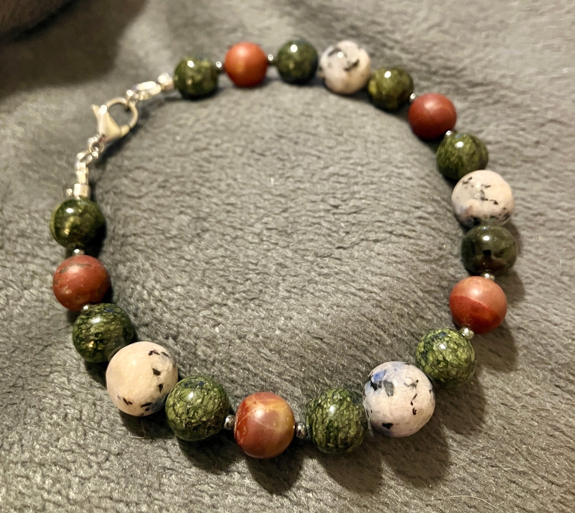 A bracelet inspired by ancient terrain and alpine clarity. Russian Serpentine offers mossy greens and subtle marbling—grounding and protective, like forest stone. Red